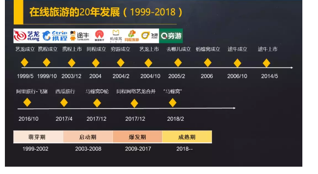 这是一张在线旅游发展关键节点的时间图,大致可以分为4个时期,从1999年携程艺龙成立的萌芽期,到2003年-2008年间的启动期。