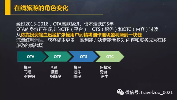 在线旅游已经从单纯OTA(代理)到OTP(平台)到OTC(内容)到OTS(服务)多种模式并存和角色的迁移,只做卖货渠道的公司,已经没有持续生存的空间。