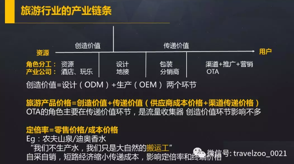 我们今天看到的旅游供应商、资源商其实是在创造价值环节,而OTA、线下门店、旅游分销商、对产品的推广、宣传都是在传递价值环节。