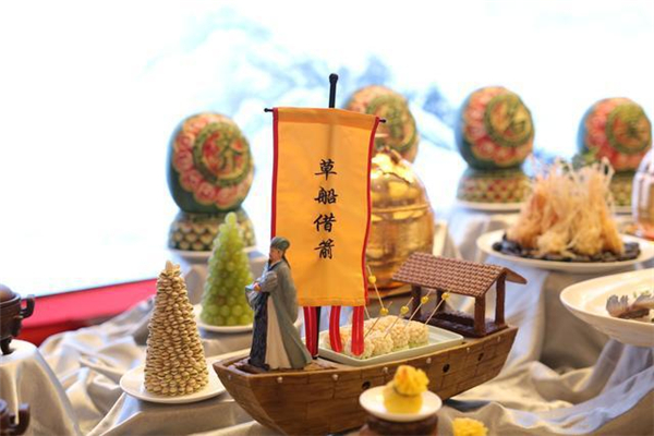 在文化创意主题宴席比赛环节,各酒店更是“使劲浑身解数”“拿出看家本事”。在银座泉城大酒店宴席,一个外形雕刻精致细腻的空心西瓜中,一只鸡静静地卧于其中。甫一上桌,这道泉水西瓜鸡就赚足评委们的眼球。山东东方大厦创新性打造的“东方琉璃喜宴”,也给评委们留下深刻印象。索菲特银座大饭店的齐鲁文化名宴,以齐鲁十二名人故事为背景,打造出“草船借箭”“孟母三迁”“藕花深处”等形神皆备的菜品,再配上独具特色的敬茶礼,中国传统文化、儒家文化于无声处渗透到每位宾客心中。舜耕山庄的上合孔府家宴、山东禧悦东方大酒店的东方鲁韵宴、中豪大酒店的雨荷素食宴、银座泉城大酒店的泉水主题宴等也颇具特色。