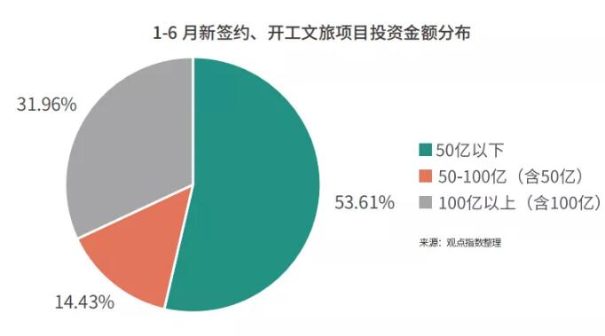 从单体项目投资金额上看,文旅项目表现出向大体量、高投入发展的趋势。今年1-6月新签约、开工文旅项目中,单体项目投资金额在50亿以下的依然在大多数,占总投资项目的53.61%;50-100亿(含50亿)投资金额的项目占比为14.43%。