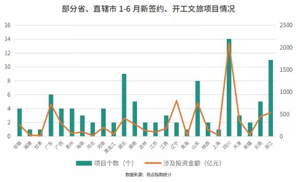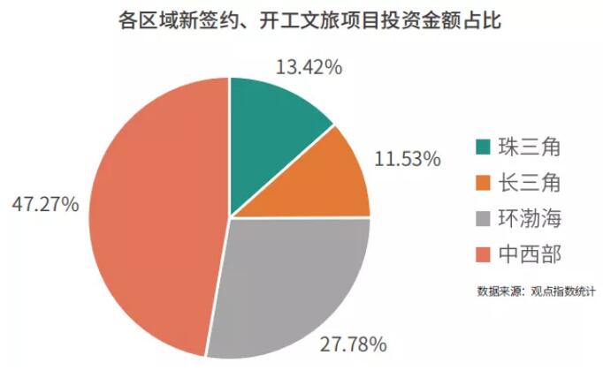 上半年,珠三角、长三角、环渤海、中西部区域新签约、开工文旅项目涉及投资金额占新增投资总金额分别为13.42%、11.53%、27.78%、47.27%,其中,中西部地区几乎占了1-6月新增文旅项目总投资的一半。