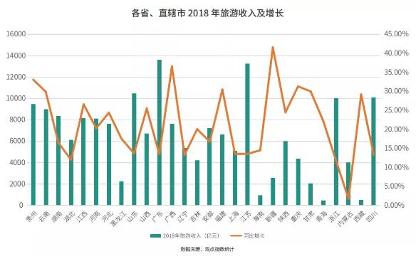 但另一方面,中西部地区省份在旅游总收入增长方面却远超过东部地区。统计数据显示,2018年,在旅游总收入增长排名前十的省、直辖市上,80%集中在了中西部地区。当中,中、西部旅游收入增长率分别为25.79%、27.69%,远超过东部地区的9.63%;此外,中、西部旅游人次增长分别为18.62%、22.65%,而东部地区仅为3.55%。