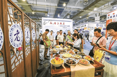 2019宁波国际旅游展上,宁波主题馆的饮食文化专区吸引不少市民驻足拍照。(李冰 摄)