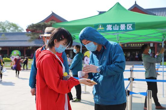 嵩山景区时刻将游客的生命安全放在第一位,科学防控疫情。每天对游客中心、观光车、休息区等旅游接待场所以及基础设施实行一日三次的环境卫生消杀。按照“先扫码量体温再入园”的防疫要求,在景区入园及游客聚集处,设置多个游客分流通道,引导游客进行健康码验证,进行体温监测与游客自助刷票入园,快速分散人流,防止游客聚集,加快了游客的进园速度。景区的观光车施行半数满员政策,每辆车承载游客不超过荷载人数的二分之一。增加各类安全类标识标牌1000余个,在游客中心广场、入口、景点、观光车乘车点等重点区域增派工作人员,时刻提醒游客做好个人防护,遵守景区防护措施,确保游客安全游览。