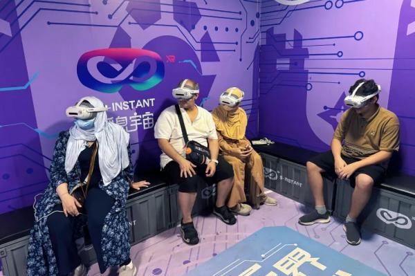 在上海影视乐园黄河路内,“元宇宙XR全感影院”瞬息魔方项目试运营首日即吸引2000余名游客争相打卡。体验者们佩戴轻量化XR设备,在虚实交融的沉浸空间中穿越星际、探秘深海,通过多维度体感反馈与视觉奇观开启“五感全开”的次元冒险。开业至今,其新奇体验迅速圈粉——周末高峰时单日体验人数超300人,从开馆到闭馆,热门主题设备几乎一直在运行。候场区常坐满等候的游客。已有多名外国游客前来体验,用不太流利的中文连说“太厉害了”。