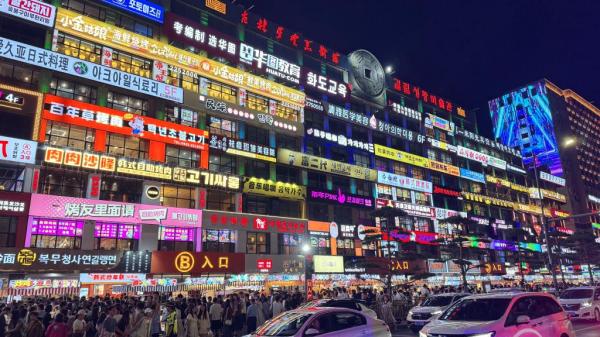 深夜十一点,延边大学“网红弹幕墙”前依然人头攒动,游客们举着印有“延吉”字样的咖啡杯拍照打卡,打糕、冷面、米肠等特色美食香气四溢,这座东北边境小城的夜,刚刚开始。